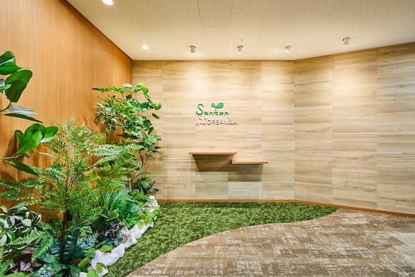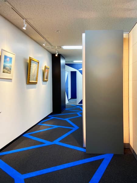↑「紡ぎ」を床で表現し、コーポレートカラーの類似色を取り入れた床デザイン。