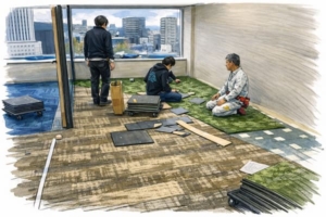オフィス移転やリニューアルをご検討中の企業様から、 最近よくいただくご相談が 「床の貼り分けって、やった方がいいですか?」 というご質問です。 床は“ただの仕上げ”と思われがちですが、 実は空間の印象や使いやすさを大きく … 続きを読む 【大阪のオフィス内装】床の貼り分けデザインで空間はここまで変わります
