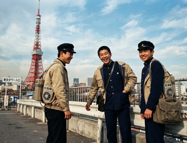 プロンプトは「もしも昭和時代に空調服があったら。東京タワーを背景に並ぶ学生、というコンセプトで画像を作る。」です。